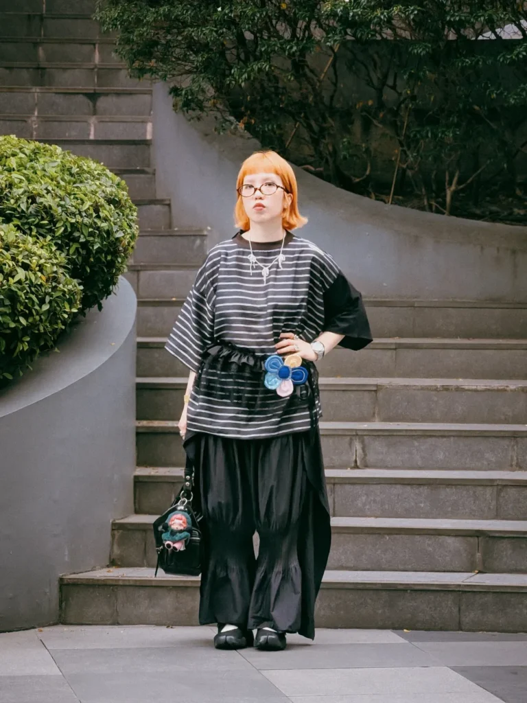 - The Inspiration: “My mantra is to always dress up as if it’s the last opportunity to showcase that specific combination of clothes. I wanted to channel a ‘creative’ vibe using my own style—mixing a fabric shirt from the local brand Proudrace with thrifted pleated pants. I layered it with a lace wrap-around skirt used as a belt and a flower brooch from Ha.mü for that essential pop of color.”