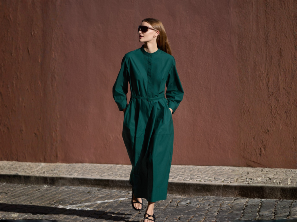 Fabric is doing a lot of the heavy lifting here too. The collection includes seasonal materials like satin sets, Milano ribbed knits, and viscose knit T-shirts, all chosen to boost comfort while keeping the finish polished.  One standout detail is the cotton volume sleeve dress, featuring softly structured shirt-style sleeves and a clip belt detail that adds shape without feeling stiff.