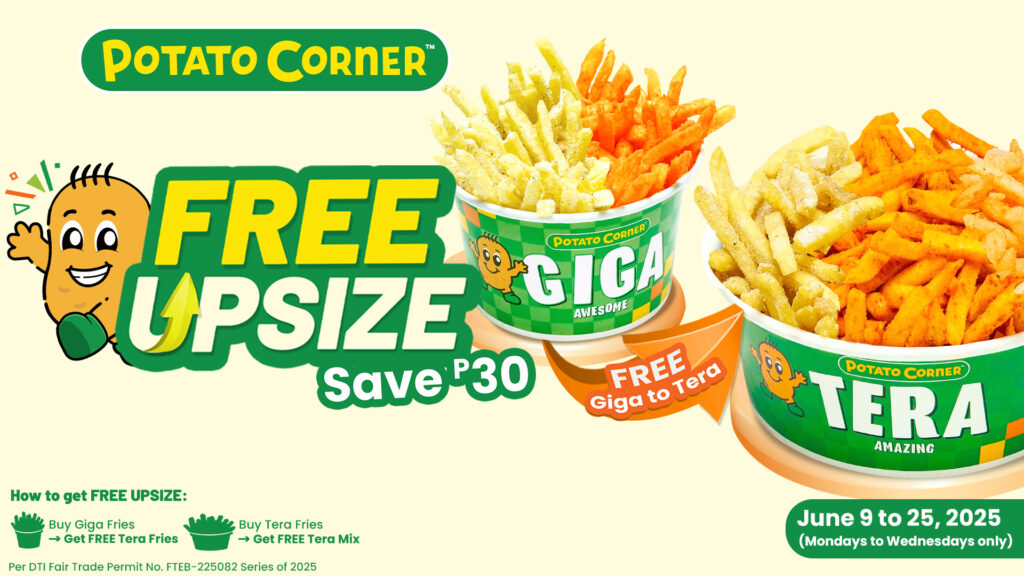 Bigger cravings deserve bigger fries. Get a free upsizing treat on select sizes from June 9 to 25, Mondays to Wednesdays only, in all Potato Corner stores.