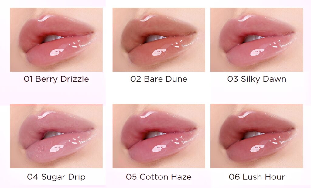 Shade-wise, the collection keeps it wearable but still fun. You’ve got six options to match different lip tones and aesthetics: 01 Berry Drizzle, 02 Bare Dune, 03 Silky Dawn, 04 Sugar Drip, 05 Cotton Haze, 06 Lush Hour.